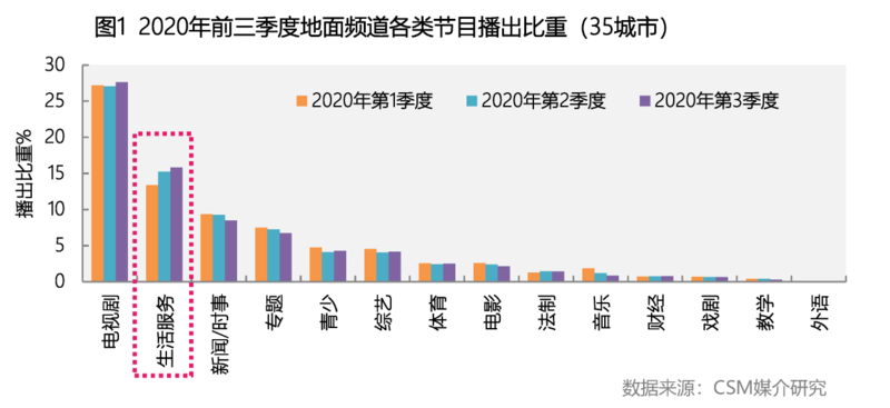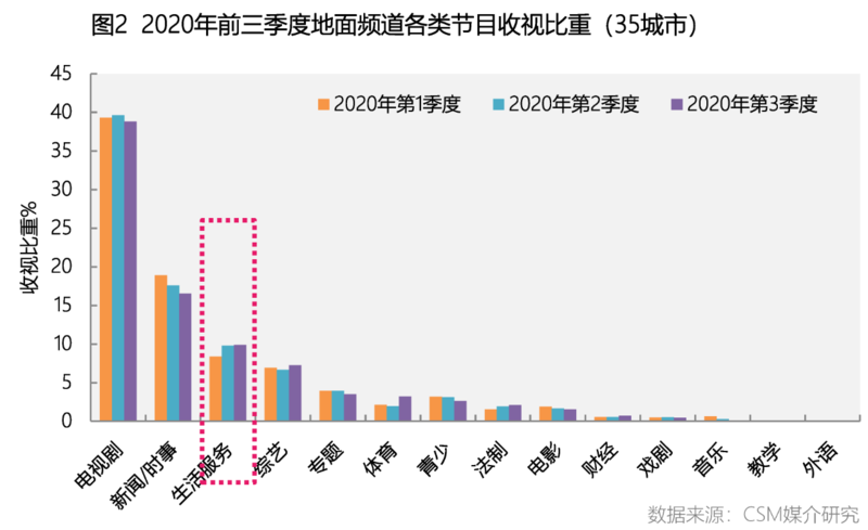 2020年第三季度,在35城市市场,地面频道生活服务类节目占所有节目播出时长的近16%,仅次于电视剧;从收视上看,生活服务类节目的人均收视总时长占全部节目收视时长的9.9%,仅次于电视剧、新闻/时事节目。因此,无论是播出量还是收视量,生活服务节目都是在疫情结束后大屏节目中恢复最为迅速的类型,季度提升十分显著,可见这一类型节目在观众心目中举足轻重的位置(图1、图2)。