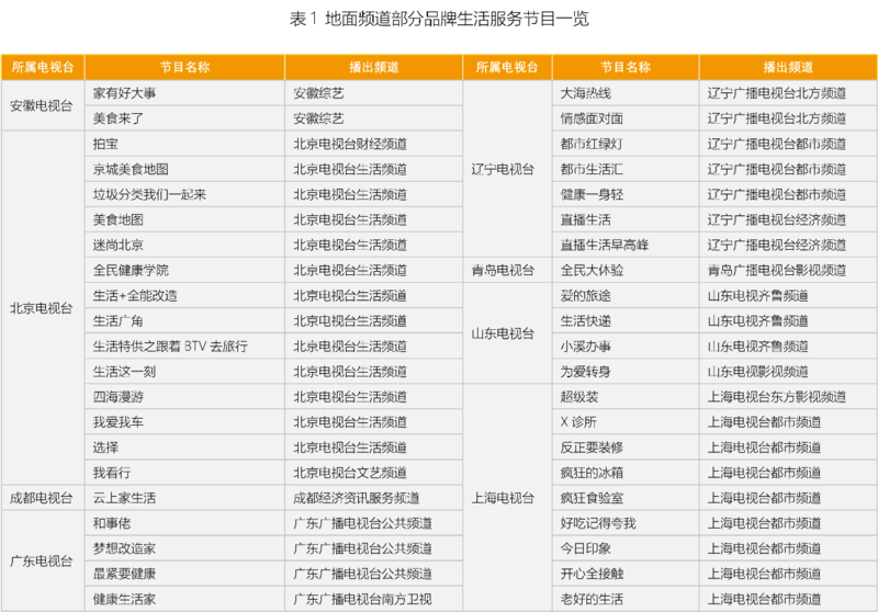 生活服务节目一直是地面频道节目创新和发展的重要领域,尤其是近年来,在外部新兴媒体挤压与内部收视下滑、经营创收锐减的双重压力,地面频道更注重生活服务类节目,凭借其本土化的地域特点,化劣势为优势,将生活服务类节目推到了一个新的高度,并形成了自己浓郁的地域特色,现已逐渐成为传统大屏收视市场中不可小觑的竞争力量。