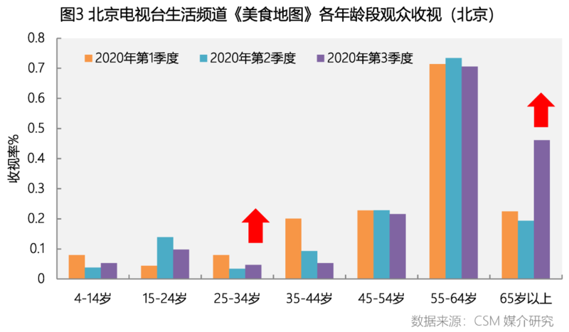 今年年中,随着国内新冠疫情逐步得到有效控制,各个城市都推出了不同形式的经济促进活动,这其中,发展夜经济、地摊经济成为各个城市的首选方式。升级后的《美食地图》节目也特别推出了“探访夜经济”主题,随着年轻人的脚步探访王府井百货大楼B2层的老北京市集——和平果局,合生汇B1层主题美食市集——21区等等,不仅探访小吃大餐,也探访美食背后的故事,助力京城的经济复苏。节目联合互联网平台推出了城市美食纪录片《北京味道》;还与抖音短视频平台共同发起2020年度北京美食品牌榜,邀请年轻人打开抖音,分享自己的美食探秘视频,全民参与领取10000个免单机会;年底还预计筹备推出“北京味道超级美食跨年夜”等活动,全面助力新消费。赢得好口碑的同时,相较于上一季度,25-34岁年轻观众收视率有小幅提升, 65岁以上老年人群收视增幅最为明显(图3)。