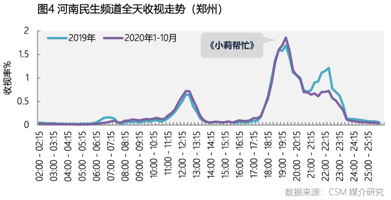 同类型的节目还有河北农民频道《非常帮助》、安徽综艺频道《家有好大事》、河南民生频道《小莉帮忙》等,以《小莉帮忙》为例,在节目表现形式上,帮忙记者以邻家小妹的角色介入事件的解决过程中,从而极大增强了观众的亲近感。这种“我在现场,我在参与”的表达方式,让帮忙记者成为了栏目的品牌象征。在自媒体如潮般发展的今天,信息碎片化随之而来,媒介能够很快得到信源发出的信号,同时迅速做出回应并加以整理,最终呈现在荧屏前。《小莉帮忙》的许多素材就源自于节目搭建的自媒体平台,一方面,素材得以被迅速回应,同时节目的影响力也随之扩大。从近两年河南民生频道全天收视走势可以明显看出,《小莉帮忙》已经成为了频道晚间收视提升的重要支柱(图4)。