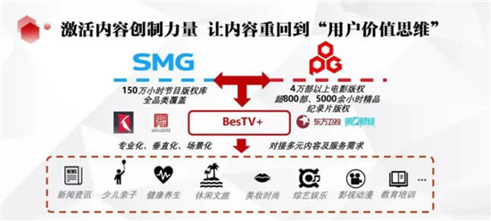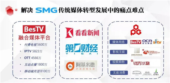 有投资机构分析认为,SMG面临着变现模式单一、业务多样庞杂、资源整合困难、传统业务增长乏力等诸多难点痛点。我们升级搭建的“BesTV+流媒体视频平台”,就是直击难点痛点,以四个“打通”策略,即打通渠道和内容生产、打通大屏和小屏、打通专网和移动互联网、打通线上和线下的全渠道文娱生活服务,构建一套内部联动机制和新消费闭环。