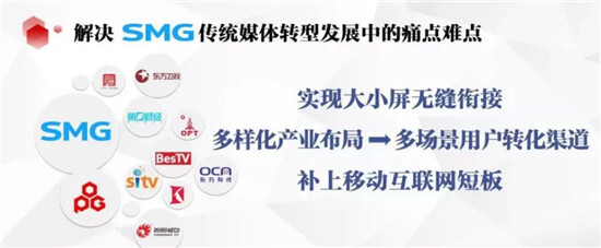 这样的打通,将充分挖掘SMG多年来积累的精品内容,充分利用我们掌握的东方有线、IPTV、OTT等家庭大屏入口,以及东方明珠塔、梅赛德斯奔驰文化中心等一批优质的实体消费空间,实现大小屏的无缝衔接,实现线上线下的无缝衔接,把多样化的产业布局转化为多场景的用户转化渠道,以线下赋能线上,补上移动互联网用户拓展的能力短板。