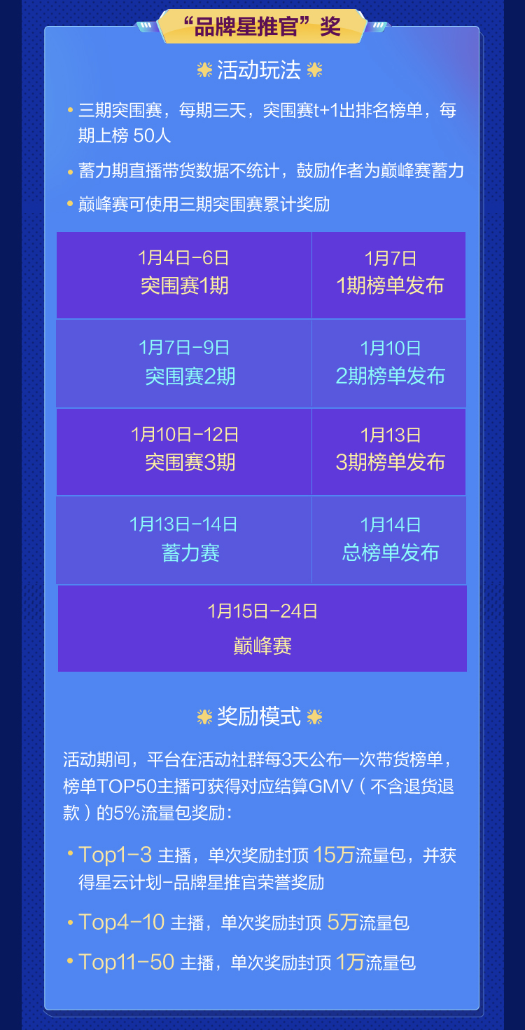 据卡思了解,自1月4日起,参与突围赛上榜的TOP3主播,最高可获得15万的流量包,并获享“品牌星推官”的荣誉奖励,与品牌建立长线合作。