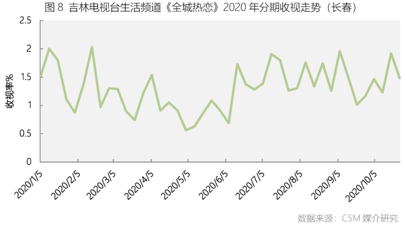 《全城热恋》是吉林电视台生活频道于2010年8月开播的一档大型生活服务类相亲、交友栏目。由吉林电视台著名主持人燕子担任主持。连续3年问鼎吉林省电视栏目收视冠军。该节目立足吉林、面相东北,从舞台置景到话题讨论处处彰显东北文化特色。节目开播至今,始终以“真相亲”为服务宗旨,通过线上录制及线下活动,已为近5000余名未婚青年男女搭建相识平台,促成400余对男女牵手成功,有150余对步入婚姻殿堂,成为东北三省未婚青年男女的首选电视婚恋交友平台。2020年1-10月份分期收视走势来看,除了疫情期间收视有所下滑外,全年整体收视均在高位保持稳定(图8)。
