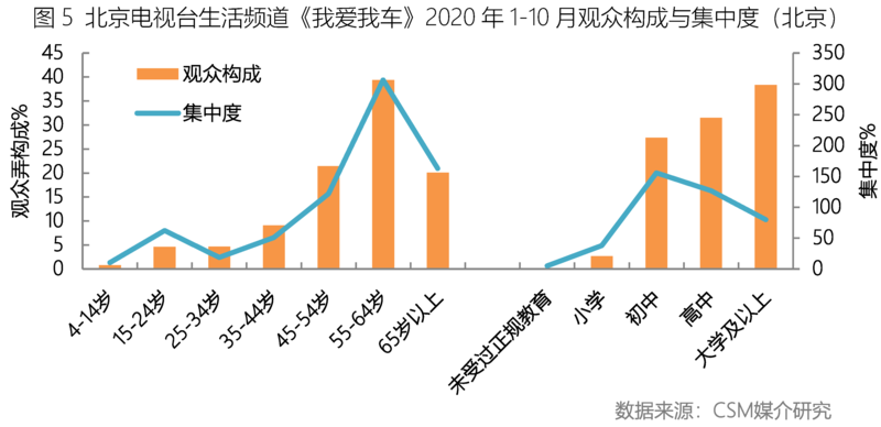 北京电视台生活频道《我爱我车》节目便垂直到爱车一族,定位于满足观众对购车、卖车、用车、赏车的要求。节目内容基本上涵盖与“车”有关的方方面面,比如针对某一款热点车型的深入报道,既有专业记者,也有业界大咖给予客观、专业的评论;还有汽车行业动态,市场热点新闻;再比如普及汽车消费知识,对购车、用车中的各种问题提供最细致的解决方案,包括购买、信贷、维修、租赁、保险等各个方面。本着以车会友的原则,讲述时尚的汽车生活和感人的爱车故事。汽车最广大的消费市场是中青年人群,节目推出适合90后甚至00后消费的设计车型;针对高端商务人士又推出高品质商务车系推荐;节目还涵盖超跑等车型的介绍。可以说,作为一档老牌节目,《我爱我车》真正做到了与时俱进,潜心服务每一个阶层、年龄层的人群,为其定制对应的节目编排。媒体融合上,节目在电视台播出的同时,在抖音与快手跑平台同步直播,实时互动。从该节目在不同人群中的构成和集中度情况可以明显看出,节目主要观众构成人群涵盖45岁及以上多个年龄层,且大学及以上高知人群构成最为突出(图5)。