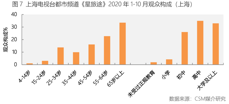 上海电视台都市频道《星旅途》是一档聚集美食、美景、人文、历史的旅游节目,这一类型节目在地面频道相对较少。节目设有《星·玩家》《星·玩法》《星·住处》等多个版块,为观众介绍网红旅行目的地的热门景点,住宿及美食。除了轻松娱乐的氛围,这档节目也经常采用悬念、铺垫、揭秘等方法进行叙事,一步步引导观众去发现美食美景,最后给出最终的答案。可以说,跌宕起伏的情节,可以牢牢的抓住观众的注意力,让观众在不知不觉中就了解到了喜爱的内容。节目不仅受到中老年人群喜爱,也吸引了不少25-34岁的年轻观众以及高中和大学以上的中高学历观众(图7)。