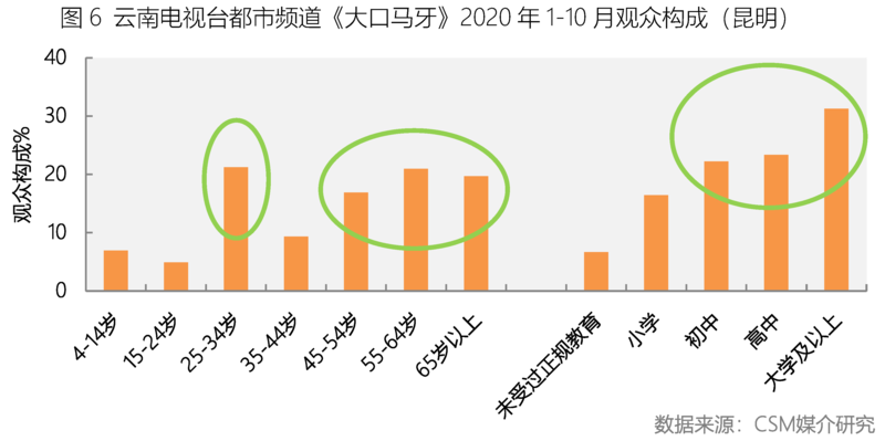 “大口马牙”是地道的老昆明方言,意思是说一个人说话不考虑实际而盲目的对一个事物进行夸大,没有考虑后果如何。云南电视台都市频道推出的一档昆明方言脱口秀节目《大口马牙》,以每天发生在昆明街头的大事小情为主要内容,加之极具亲和力的方言,让人耳目一新,节目自2006年开播至今已连续播出14年。为了吸引年轻的观众,招牌主持的作用不可或缺,稳重的“老钱师”是中甸的藏族,可爱的“小咪渣”是思茅彝族,一个瘦精干巴,一个营养过剩,一起主持默契十足,妙语连珠。为了更加吸引年轻观众,节目还采用了拍摄小电影的方式,市井百姓身边的许多新闻,诸如坑蒙拐骗、小偷偷东西此类发生在瞬间的事情,是很难全部采集到直击现场的画面的,对于这些,《大口马牙》有一绝招——将大家提供的素材拍成小电影,使得场景重现,在轻松搞笑中针砭时弊。让电视机前的观众,仿佛回到了自己的生活,看到了自己和熟悉的人群,催生感动与共鸣。节目深受25-34岁、45岁以上、中高学历观众的喜爱(图6)。