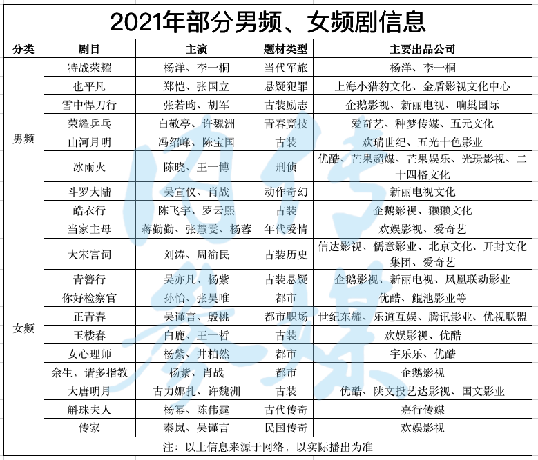 传媒内参将2020年已播剧集中的部分男频剧、女频剧进行信息汇总,指出各自优劣势的同时,分析2021年的待播剧集及播出趋势。