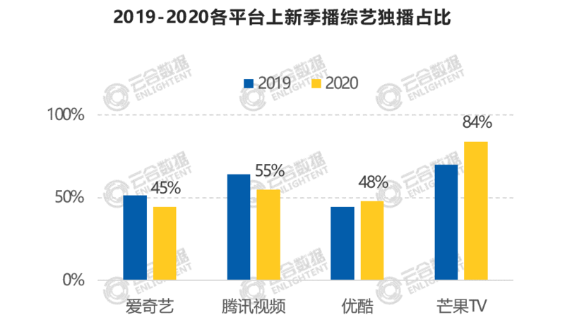 分平台来看,爱奇艺、腾讯视频、优酷独播综艺占比在50%左右,芒果TV独播综艺占比突破80%。