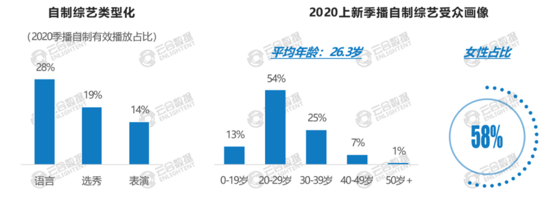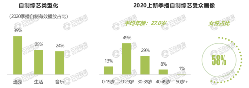 用户画像:2020年四大平台上新季播自制综艺用户平均年龄在27岁上下,女性占比60%左右。