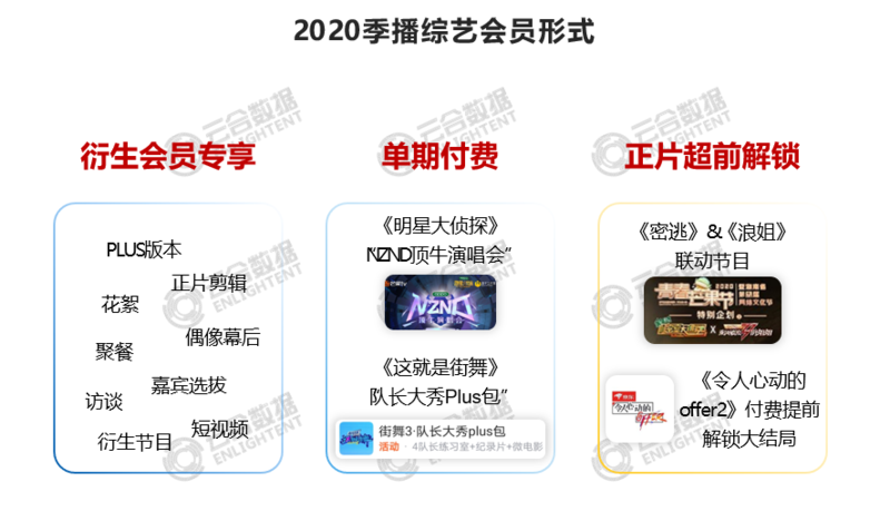 2020年会员付费内容形式更为多样化,继衍生会员专享,衍生单点付费后,芒果TV《密室大逃脱X乘风破浪的姐姐》 《明星大侦探》等节目均开启单期付费模式;腾讯视频《令人心动的offer第2季》超前点播解锁大结局,视频平台加速探索综艺的会员服务模式、挖掘存量市场价值。