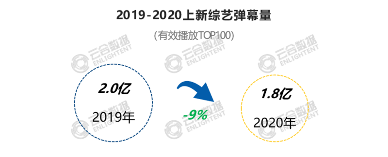 2020年上新综艺有效播放TOP100总弹幕量1.8亿,评论量701万,同比2019年TOP100分别下滑9%和24%。