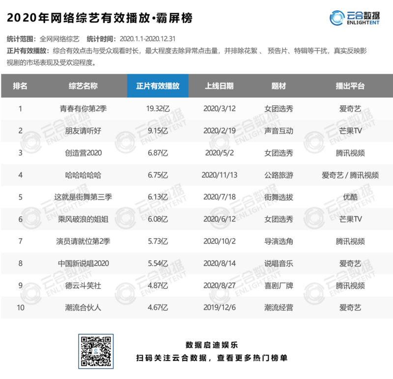 2020全网网络综艺有效播放霸屏榜