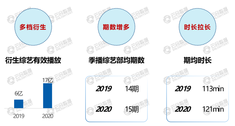 2020综艺节目内容体量大幅增长,一期节目分上下,一周多更,会员PLUS、多档衍生等编排形式也更为多样化;2020年正片节目衍生综艺的有效播放17亿,同比增长184%;季播综艺增至15期/部,其中14%的节目采取一周双更模式;期均时长也由19年的113分钟扩增至121分钟,而头部有效播放TOP50节目平均时长更是高达155分钟/期。