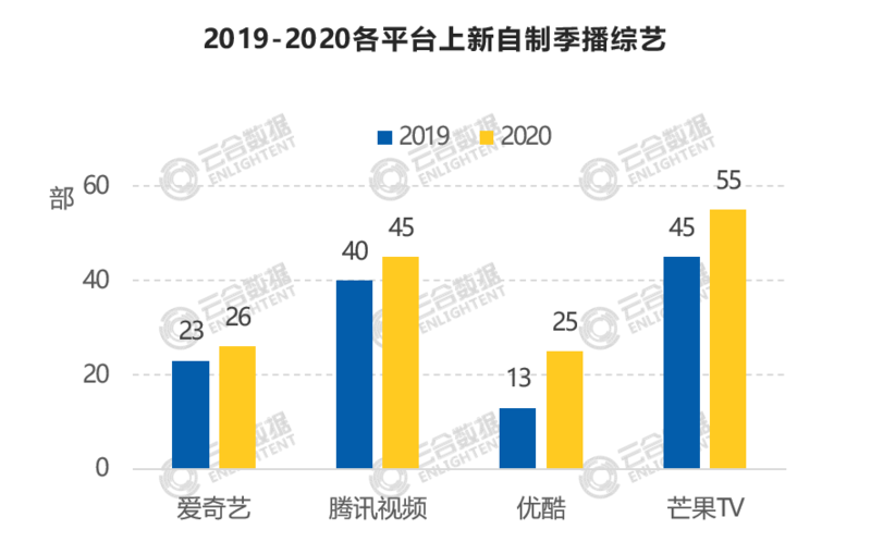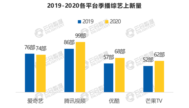 上新:2020上线季播综艺240部,同比增加25部;爱奇艺、优酷、芒果TV上新量在70部左右,腾讯视频高达99部。