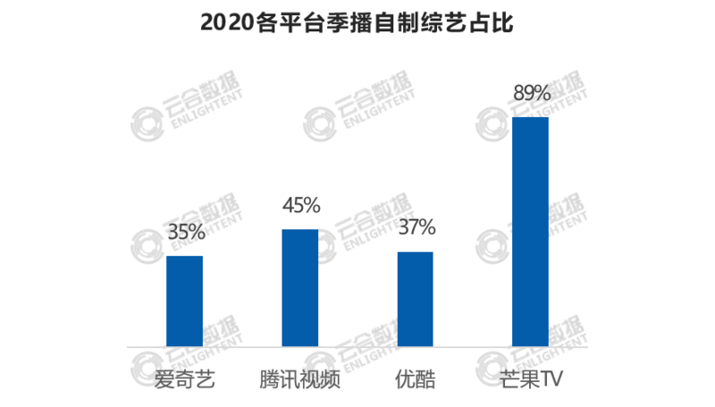 各平台自制综艺比例均在35%以上,芒果TV的自制综艺占比高达89%。