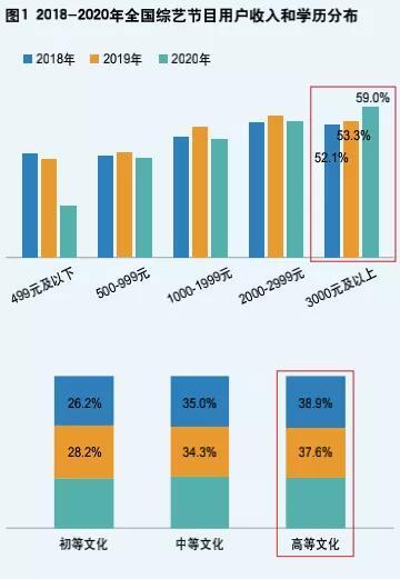 受众是综艺的起点,也是综艺的未来,中国综艺市场拥有超过6亿核心用户。根据美兰德2018—2020年连续三年全国常住人口入户抽样调查数据显示:全国喜爱综艺内容的用户比例逐年增长,2020年占比达到50.3%,其中综艺节目用户女性占比62%,男性占比38%,20—49岁人群依然是综艺节目的核心主力观看群体。整体来看,综艺受众女性向、年轻向的特征依然显著。近几年,随着综艺节目题材丰富和传播样态多元,综艺向全年龄段和高知用户的渗透非常明显。数据显示,50岁以下人群对于综艺节目的喜爱率均超过50%,其中在25—34岁年轻群体中喜爱综艺的用户占比逐年上升,在2020年达到65%。同时,高等文化人群与高收入用户观看综艺节目的占比也在增长,2020年综艺用户中高等文化水平用户占比38.9%,收入超过3000元以上用户占比59%。综艺+生活的观察类、旅行类等综艺的崛起,显然使中年人的生活有了更多元的观察角度与解题思路。无论是在共鸣感上,还是在具有全民讨论度的话题点上,都具有强大的先天优势。
