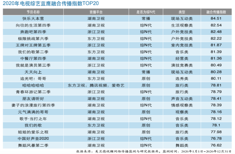 2020年,全网综艺发展势头强劲,电视媒体、视频网站及短视频平台等以老牌综N代为王牌旗舰,推出系列节目及衍生内容以增强受众黏性,同时不断创新、极致挖掘各类元素,打造原创综艺新优质IP。