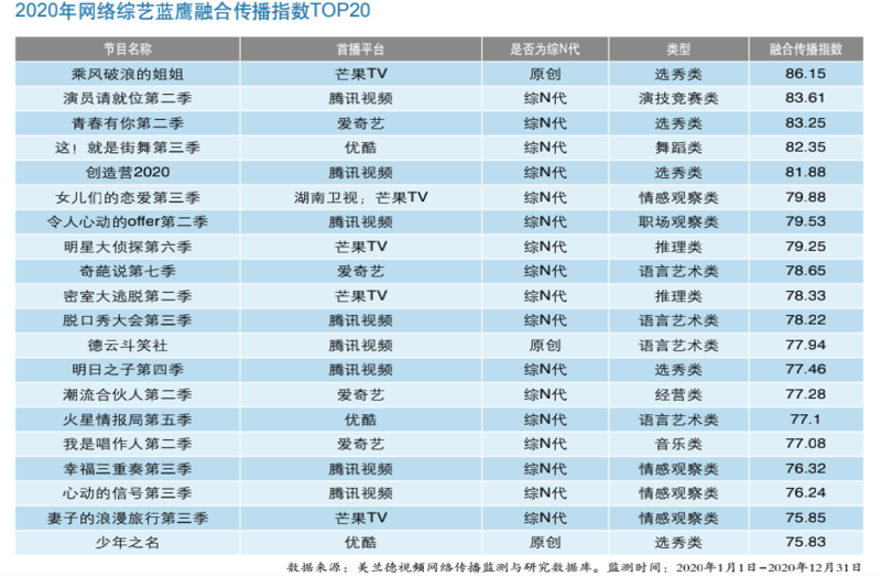 《乘风破浪的姐姐》排名2020年度全网综艺蓝鹰融合传播指数第一位,微博同名话题阅读量高达 463.4 亿次,讨论量2107万条,其本质就是一次台网综艺融合的实践,是全域综艺多维立体传播的成功。