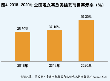 根据调查数据显示:2020年喜剧搞笑、娱乐脱口秀和音乐表演类成为全国观众最喜爱的三大综艺节目类型。2018—2020全国观众对于喜剧综艺节目的喜爱率从35.5%提升至49.3%。东方卫视的《欢乐喜剧人第六季》、湖南卫视的《你笑起来真好看》及CCTV-3综艺频道的《喜剧+》节目融合传播表现均有亮点可呈。腾讯视频《德云斗笑社》微博提及量突破824万条,视频点击量12.6亿次,均位列喜剧类节目分项指标第一位。2021年头部平台计划有近18档喜剧综艺在各大平台上线播出,内容涉及语言类脱口秀、相声、短剧表演、真人秀等多种品类。