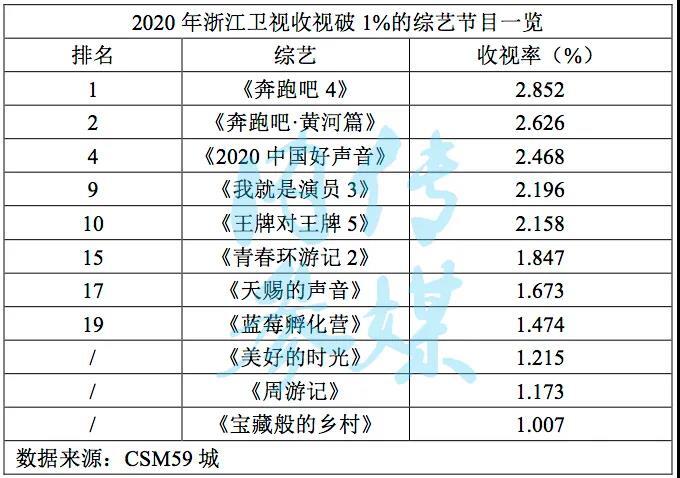 2020年省级卫视综艺节目收视前十中,浙江卫视坐拥5档。分别是《奔跑吧4》(2.852%)第一、《奔跑吧·黄河篇》(2.626%)第二、《2020中国好声音》(2.468%)第四、《我就是演员3》(2.196%)第九、《王牌对王牌5》(2.158%)第十。