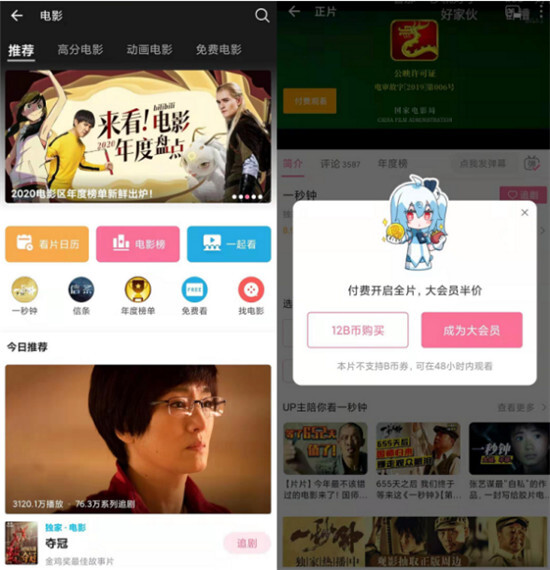 资费方面,有些内容是平台会员免费看,有些单点付费,如比较新的《一秒钟》单点付费价格12元,会员半价,这个跟欢喜首映自己平台的价格也是一致的;不过《夺冠》在B站是会员免费看,在欢喜首映则普通购买9.9,VIP购买4.9。