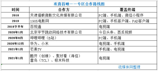 2021:“欢喜首映”在“芒果TV”APP及湖南快乐阳光运营的湖南省运营商互联网电视业务的全部终端设立内容专区,从内容专区所产生的所有收入经扣除相关成后由双方进行分成,战略合作协议为期3年。分别与海信电视旗下聚好看科技、创维电视旗下酷开网络、TCL电视旗下雷鸟科技及极米科技达成合作协议,并已正式推出视频领域业务合作,在以上各家运营的电视机终端及平台设立欢喜首映专区。