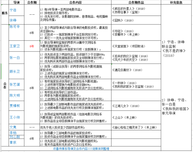 欢喜传媒的董事以及合作导演供14名,合作导演的合同期基本都是六年,合作期内约定2-3部作品的投资权。流媒体网整理了一个欢喜传媒绑定导演及作品表格(如下):