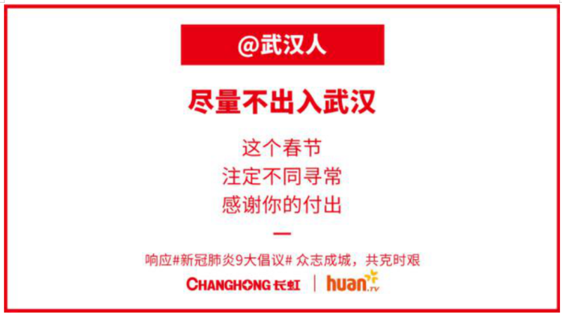 OTT TV产业链相关各方也主动适应形势变化,积极提供开机、贴片等核心广告资源,为疫情关键时刻做出突出贡献的企业发声,持续传递正向声音。如,未来电视、国广东方、银河互联网电视协同合作、共同发起《共战疫情 武汉加油》互联网电视播控平台公益广告展播活动;CAAC智能大屏营销研究院主办、欢网等联合协办的大屏战“疫”公益联动,共同宣传品牌公益行为与全民积极抗“疫”行动;康佳智能电视联合唯品会、欢乐谷、58同城、壳牌、联合利华等品牌主免费上线公益广告展播等等。