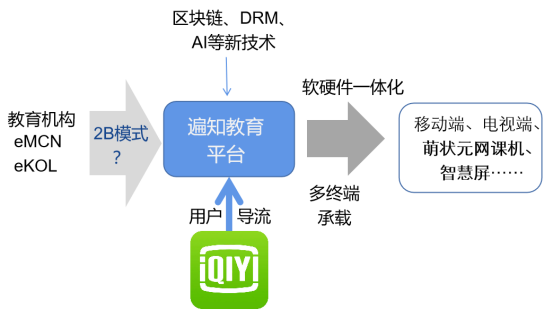 也就是说,在线教育产业亟需解决在线教育营销/招生问题与产品体验问题——这就是智慧教育领域潜藏的平台发展机遇。这正是爱奇艺打造遍知平台的背景。其目标一方面是降低在线教育获客成本,同时提升产IP体验。当然,这其中也少不了AI、区块链、DRM等新技术的投入。其中,“AI+教育”必然引领智慧教育发展趋势,而区块链、DRM则有助于解决目前在线教育严重的盗版问题(参考《劲语快评|在线教育成盗版重灾区,国内OTT出海迎变局》)。因为,在当前的技术环境下,必须通过科技创新包括萌状元这样的软硬件一体化服务打造专属的教育环境,提升教育产品“仪式感”。从业务模式来看,遍知平台更多属于2B&2C模式。从竞争性来看,遍知平台的业务模式与电信运营商及广电运营商存在直接竞争。