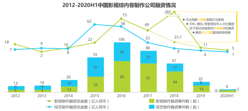 随着自2017年起内容领域监管趋严,导致资本市场迅速降温,全面进入冷静期。2018年起,互联网巨头介入整合资源,投融资热点具有从综艺制作向影视制作发散的态势。