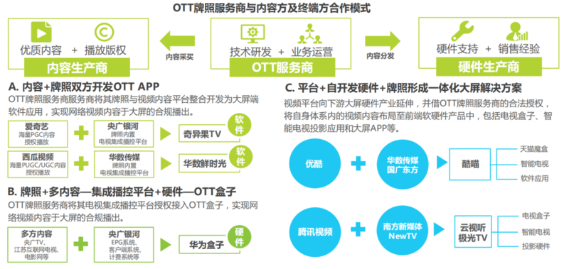 七大OTT牌照商作为中间人角色,通过视频内容生产商获取影视内容版权和垂直化内容播放授权,与电视机和机顶盒等制造商合作,输出多渠道、多品类的互联网电视内容。