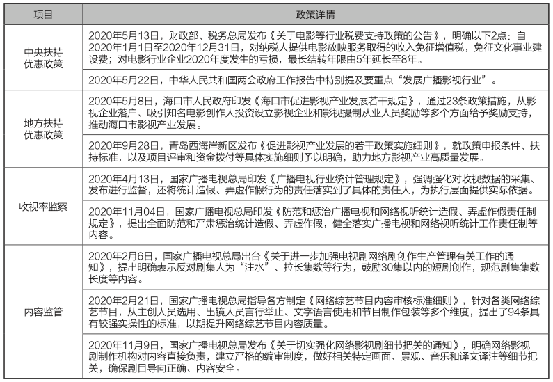 与此同时,2020年在特殊的市场环境下,政策对长视频市场的规整也逐步提升,推动市场向更为规范的方向发展。除了年初国家电影局、国家广播电视总局等政府部门因抗疫要求对影院复工、疫情防控报道等方面提出相关指导外,相关监管部门还在这一年进一步对收视率造假、剧集注水、内容审核等方面进行了规范和监管。同时,一系列针对深受疫情影响的电影市场的扶持政策接连推出,力图激活影视市场活力。