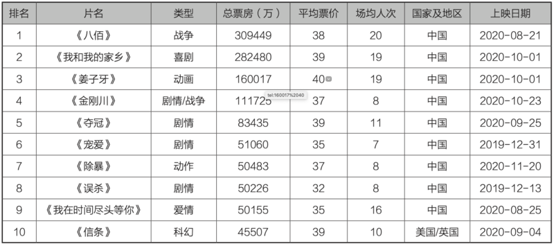 另外,结合2020年特殊时代背景,主旋律献礼片也表现亮眼,以《八佰》为代表的多部影片位列年度票房榜前列。除此之外,抗疫相关题材的电视剧《在一起》和纪录片《人间世·抗疫特别节目》等表现也尤为亮眼。