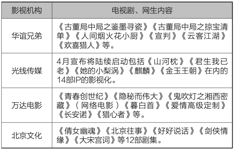 一方面,不少机构积极调整原有业务重点,提升抗风险能力。例如,华谊兄弟、北京文化和万达电影等侧重电影业务的公司在电视剧和网生内容方面持续发力;爱奇艺、腾讯视频等互联网视频平台加大自制剧和定制剧内容业务布局,增强话语权,持续降低采购成本。
