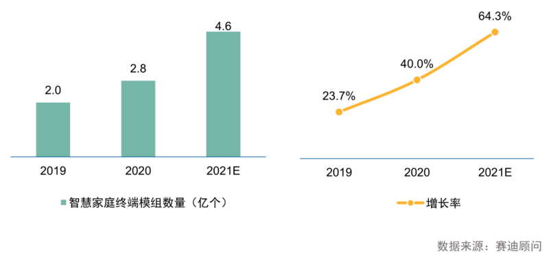 图 4 2019-2021年中国智慧家庭模组市场出货量及增长率预测