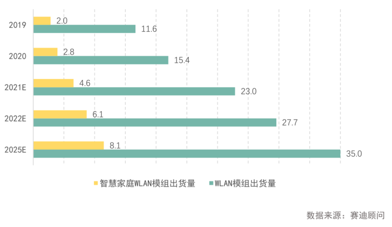 物联网无线通信模组是联接物联网感知层和传输层的重要环节。作为将物联网终端设备接入网络的模块,无线通信模组承载设备“端到端”通信与数据传输交互的功能,是物联网设备终端的核心硬件组成部分。物联网连接数与无线通信模组需求存在一一对应关系,是一个增量充分的广阔市场。其中,无线局域网(WLAN)模组大量应用于智慧家庭场景之中。我们预计,到2025年,中国WLAN物联网模组的市场出货总量将达35亿个,用于数字化智慧家庭终端的模组数量将增至8.1亿个,年复合增长率超过20%。