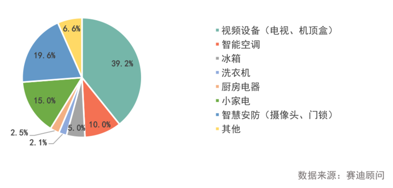 产品分布方面,家庭视频视讯设备(电视机、机顶盒)和智慧安防产品(摄像头、门锁)占比最高,分别达到39.2%和19.6%;智能白电(冰箱、空调、洗衣机)占比接近两成,达到17.1%。
