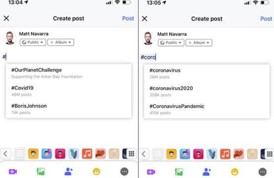 尽管以往大多数创作者都不会在Facebook帖子中添加标签,但Facebook正在进行主题标签的推荐测试。2020年9月,该项测试仅针对特定受众展开,并被视为扩大用户互动范围的有效举措。社交媒体专家Matt Navarra表示,Facebook的推荐标签列表不仅会显示基于文本预测的标签,还会列出使用该标签的Facebook帖子数量。类似于Instagram的“探索”列表,后者会在搜索建议中显示标签的具体使用情况。