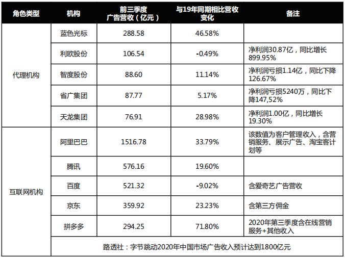 2020年前三季度中国营销服务机构广告营收表现