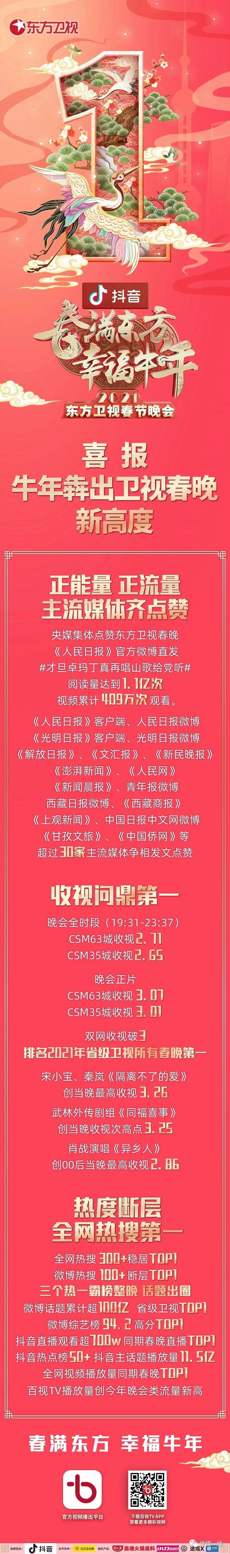 2021年是中国共产党建党100周年,也是西藏和平解放70周年,而凑巧的是,2021年藏历新年与农历春节是同一天。在这个特殊的时代大背景下,东方卫视春晚将时代命题与家国情怀融入海派特色浓郁的节目创作中,84岁属牛的藏族歌唱家才旦卓玛再度唱响经典歌曲《唱支山歌给党听》,而男中音歌唱家廖昌永与2020年最当红的藏族小伙丁真分别在晚会现场和格聂雪山隔空对唱了《再唱山歌给党听》,这一体现三代传承、呼应时代主题的节目一经播出便备受观众好评,节目视频被人民日报官微转发,6小时内阅读量达 562 万,点赞量超4万。