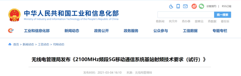 【流媒体网】摘要:2021年3月4日,工信部公布了《2100MHz频段5G移动通信系统基站射频技术要求(试行)》。