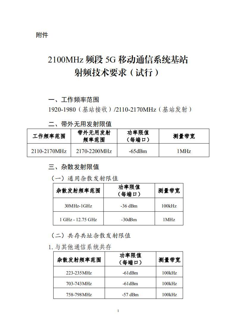 附件:2100MHz频段5G移动通信系统基站射频技术要求(试行)