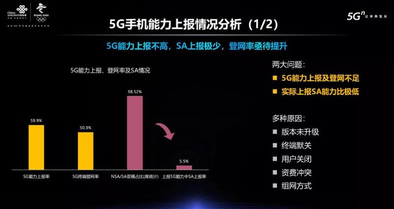 面对机遇与挑战,中国联通将秉承“开放合作,互利共赢”的理念,持续赋能产业共振,与合作伙伴共克时艰、公开新篇、共筑产业新生态。日前,中国联通正式发布《中国联通5G终端发展指数及性能报告》显示,5G能力上报不高,SA上报极少,登网率亟待提升。