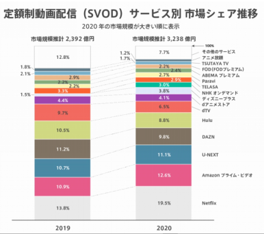 其中,SVOD (订阅型视频点播)市场规模继续扩大,Netflix连续2年稳坐世界第一位,2020年市场占有率进一步扩大到19.5%(同比增长+5.7pt)。