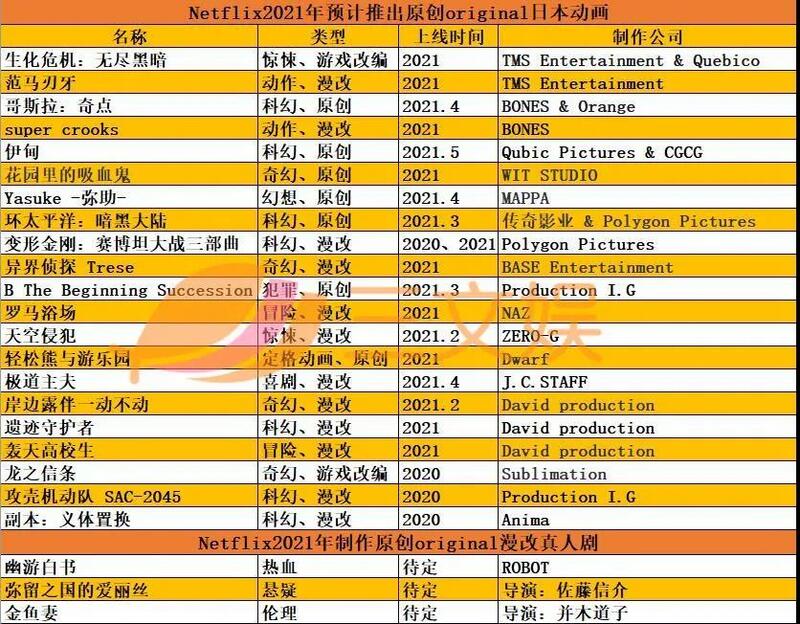 先来看看Netflix发布的2021年上线原创original日本动画及计划制作的漫改真人影视项目。