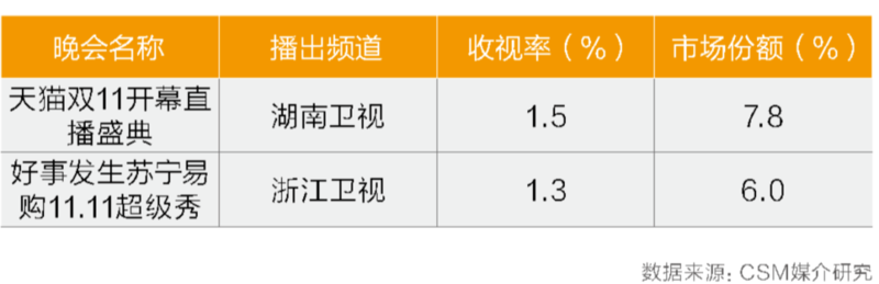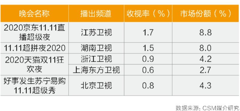 2020年的“双11”晚会竞争相比往年更加激烈。其中江苏卫视的《2020京东11.11直播超级夜》收视率1.7%,同时段市场份额8.8%。湖南卫视与拼多多合作的《11.11超拼夜2020》收视率1.5%,同时段市场份额8.0%。浙江卫视和上海东方卫视联合直播的《2020天猫双11狂欢夜》,两频道总收视率为1.5%,同时段总市场份额6.9%。北京卫视与苏宁易购合作的《好事发生苏宁易购11.11超级秀》收视率0.8%,同时段市场份额4.3%。