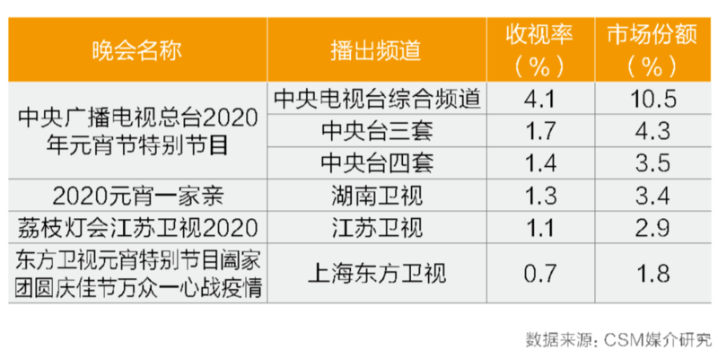 2月8日:元宵特别节目播出2020年元宵节,全国人民同心战疫,中央广播电视总台的元宵特别节目在中央电视台综合频道、中央台三套和中央台四套并机播出的总收视率达到7.2%,同时段总市场份额18.3%。省级上星频道中,湖南卫视、江苏卫视、上海东方卫视等也都举办了元宵特别节目,其中湖南卫视的《2020元宵一家亲》平均收视率为1.3%,同时段份额3.4%,江苏卫视《荔枝灯会江苏卫视2020》平均收视率为1.1%,同时段份额2.9%,上海东方卫视元宵特别节目的平均收视率为0.7%,同时段份额1.8%。