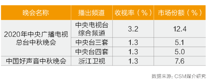 2020年中秋恰逢国庆日,中央广播电视总台中秋晚会于2020年10月1日晚间在中央电视台综合频道、三套和四套并机直播,三个频道收视率分别为3.2%、1.3%和1.3%,总收视率达到5.8%,同时段总市场份额22.5%。浙江卫视也于当晚播出的《中国好声音中秋晚会夜》收视率为1.3%。