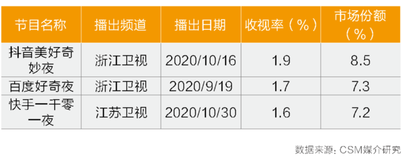 10月16日:《抖音美好奇妙夜》推出2020年移动互联网头部平台公司纷纷与省级上星频道合作推出品牌晚会,其中浙江卫视2020年10月16日播出的《抖音美好奇妙夜》收视率1.9%,同时段市场份额8.5%;9月19日播出的《百度好奇夜》收视率1.7%,同时段市场份额7.3%;10月30日,江苏卫视与快手合作的《快手一千零一夜》收视率1.6%,同时段市场份额7.2%。